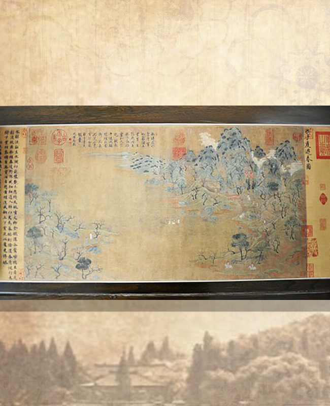 此图描绘了江南二月桃杏争艳时人们春游情景。全画以自然景色为主,放目远眺:青山耸峙,江流无际,花团锦簇,湖光山色,永波粼粼,人物、佛寺点缀其间。笔法细劲流利。在设色和用笔上,颇为古意盎然, 山峦树石皆空勾无皴,但线条已有轻重、顿挫的变化。以浓烈色彩渲染,烘托出秀美河山的盎然生机。