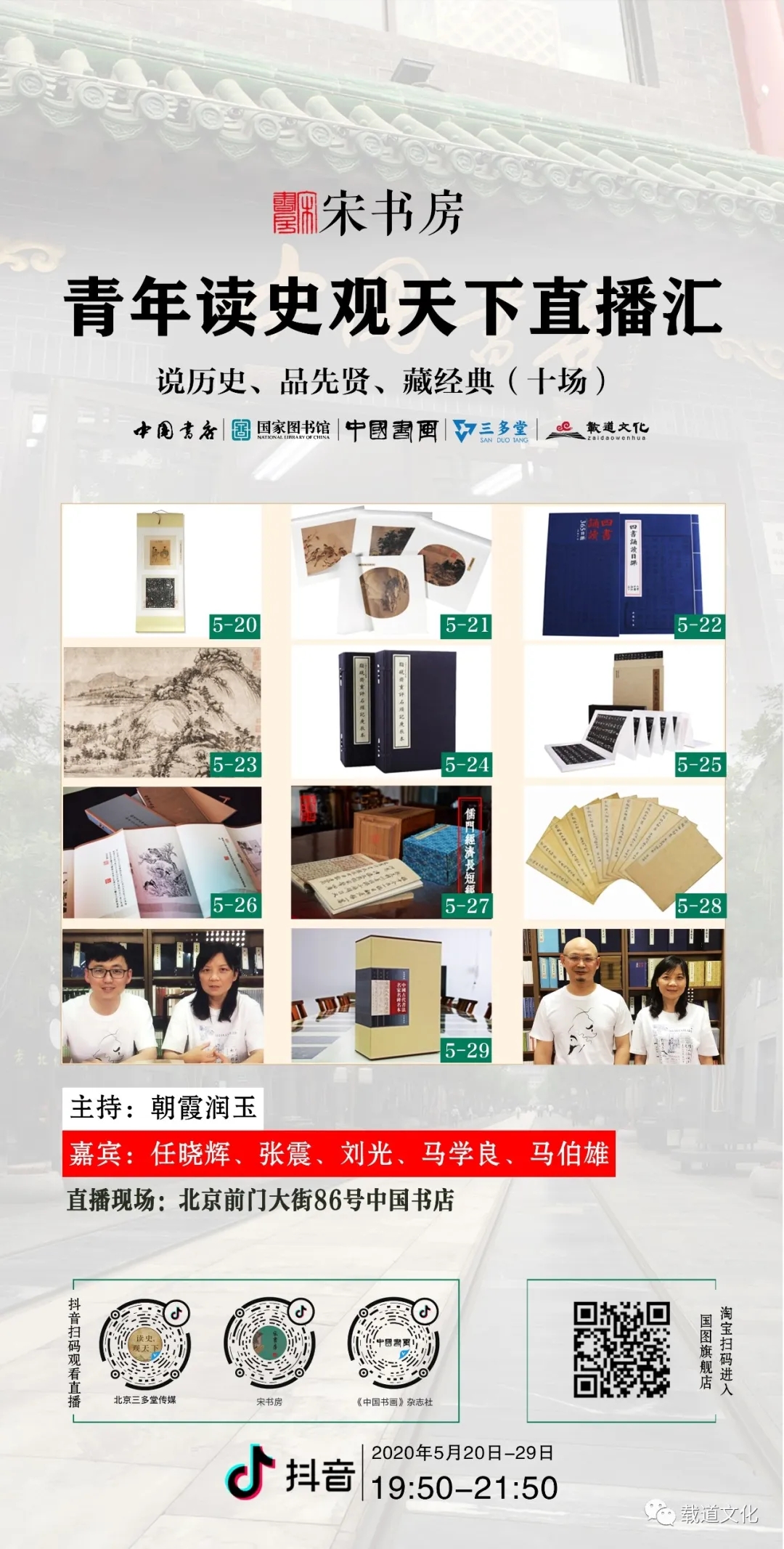 2020年5月20日至5月29日,载道文化联合中国书店、国图文创、中国书画杂志、三多堂传媒一起,在北京前门步行街86号中国书店举办了“宋书房青年读史观天下”直播汇,实现了新媒体抖音、腾讯、淘宝等直播平台的用户体验和对话,取得了圆满的成功。